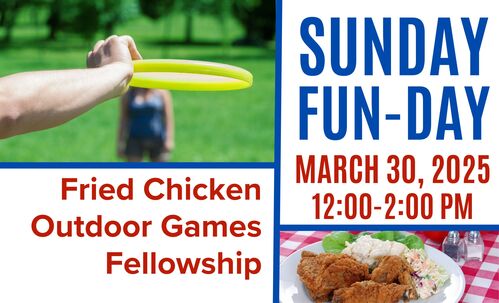 It's time for another Sunday Fun-Day Church Picnic! Save the date March 30 from 12:00-2:00 for Ultimate Frisbee and Lawn Games at the church. Lunch is provided, Fried Chicken. All ages welcome! Outdoor seating available, come enjoy good company and the beautiful weather! It's a great day to invite a friend to church. RSVP is helpful but not needed to attend.