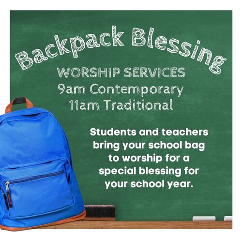 BACKPACK BLESSINGS- Bring your school bag with you to church for a blessing and prayer with Pastor Robert. Students, teachers, and all those who are part of a school are welcome! Each person will receive a special tag to add to your school bag as a reminder that God is with you and your church family is praying for you.