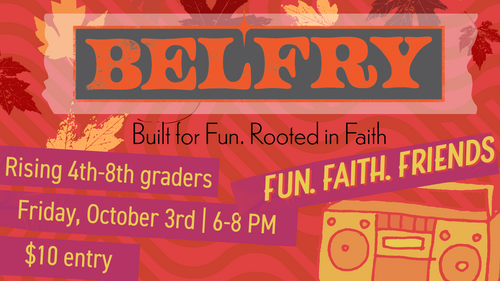 Belfry is a fun night for rising 4th - 8th graders filled with Music & Dancing, Games, and Crafts, all supervised by background checked adults in a cellphone-free zone.