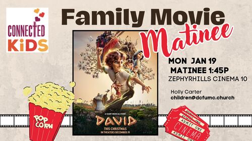 Let's catch DAVID before it leaves the theaters! Meet at the Zephyrhills Cinema (6848 Gall Blvd. Zephyrhills, Fl 33542) at 1:30pm on Monday, January 19. Showtime is 1:45pm. This is not a drop-off event, but rather a fun Family Movie Day!