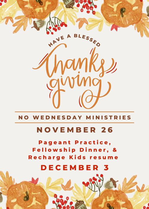 Wishing your family a blessed Thanksgiving. All regularly scheduled Wednesday ministries are canceled this week.